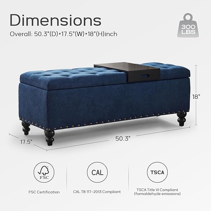 HUIMO 51-inch Storage Ottoman Bench with Removable Tray, Bedroom Bench with Button-Tufted, Safety Hinge Ottoman in Upholstered Fabrics, Large Long Bench for Living Room, Bedroom (Bule)