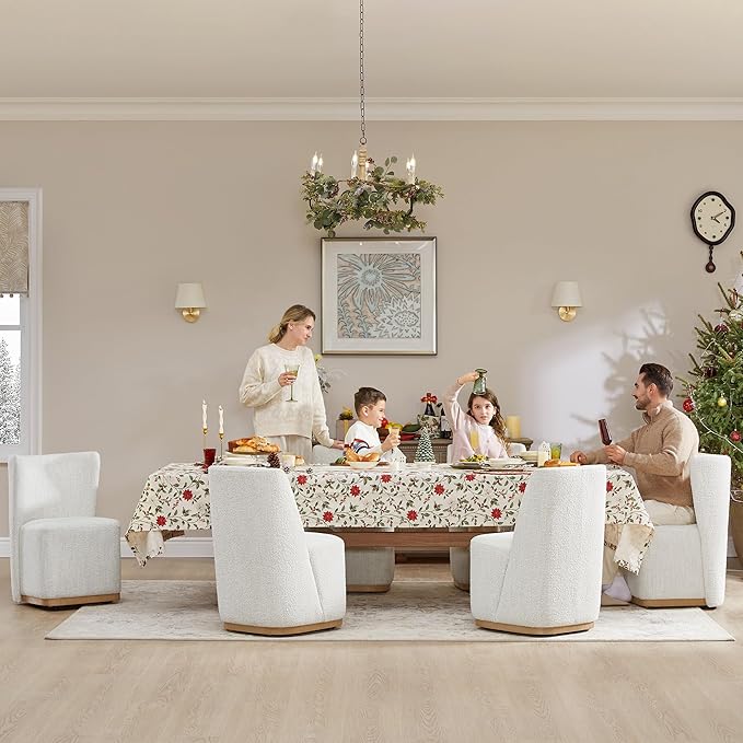 - Modern Wingback Dining Chair - This chair artfully combines mid-century wingback design with contemporary flair, resulting in a graceful yet vibrant masterpiece. It features an attractive birch wood base that ensures stability and adds visual appeal. Upholstered in textured boucle and chenille fabric, it introduces a fresh aesthetic and magical tactile experience, promising both softness and durability. Whether used as dining or desk chairs, the removable casters hidden beneath the wooden plinth allow for smooth rolling across any setting.