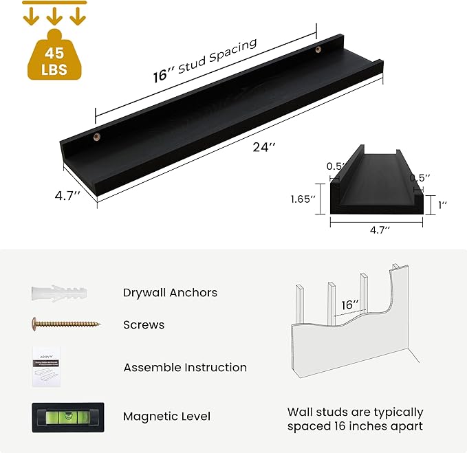 - Secure and Reliable: The mounting holes are expertly spaced at 16 inches to align perfectly with wall studs, ensuring a secure installation. Each wall shelf supports up to 45 lbs, This thoughtful design guarantees that your floating shelf with lip are anchored safely, offering stability and peace of mind for displaying any of your favorite items