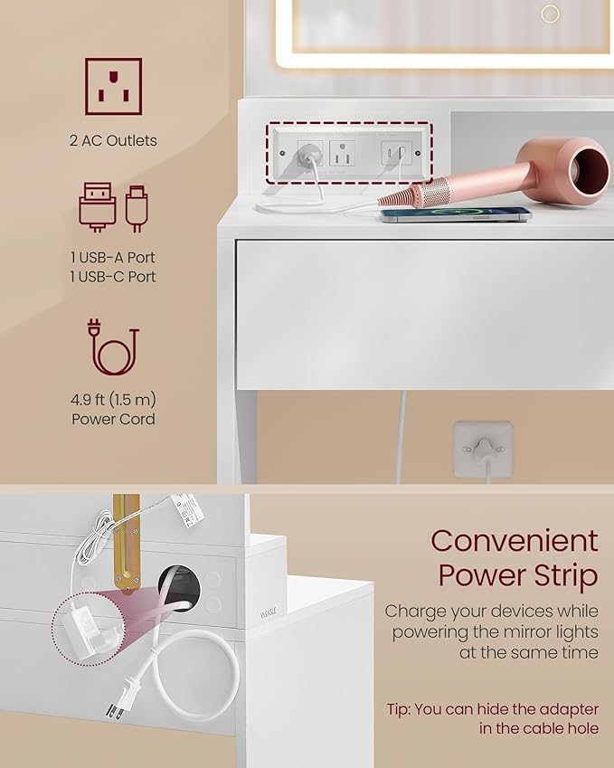 - Convenient Charging Station: This vanity desk includes 2 AC outlets, 1 USB-A port, and 1 USB-C port for conveniently charging your phone or powering beauty tools. The mirror's light is cleverly wired into the strip, freeing up an outlet for other devices