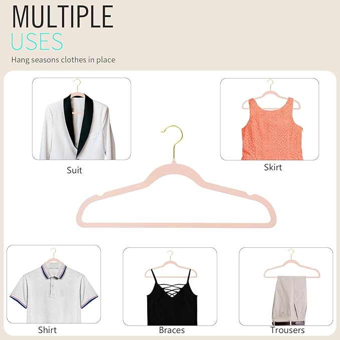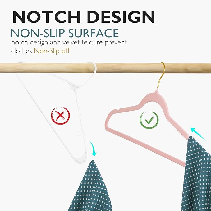 - [Hanging All Clothes]: The Premium velvet adult clothes hangers are perfect hanging your shirts, pants, jackets, dresses and more. A Golden-plated 360-degree-swivel hook on the velvet coat hangers helps you move the hangers easily when you need access to your clothes to get from hangers.