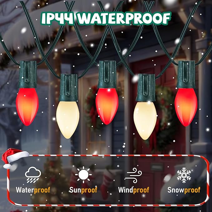 - Brighten Your Christmas Nights:Transform your outdoor and indoor spaces with our C7 LED Christmas Lights. This 25-foot string features 27 vibrant red and white LED bulbs (including 2 spares), each using only 0.6 watts. The opaque ceramic housing ensures a warm glow, creating a festive atmosphere perfect for Christmas parties, weddings, and backyard gatherings.