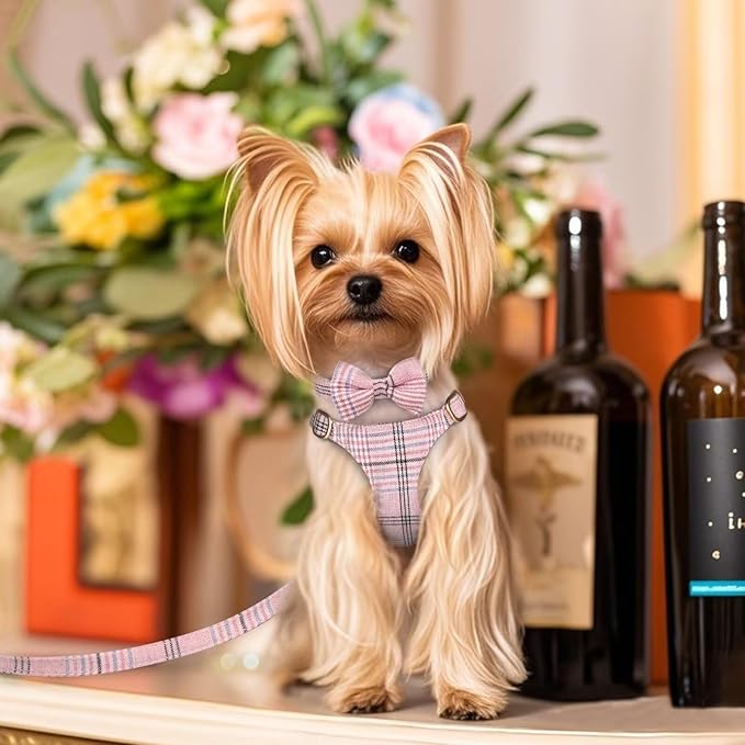 Beirui Cute Extra Small Dog Harness Collar and Leash Set with Bowtie, Soft Adjustable Plaid Puppy Harness for Small Sized Dogs Cats Walks Parties and Photoshoots(Pink,XXS:Chest 12-14")