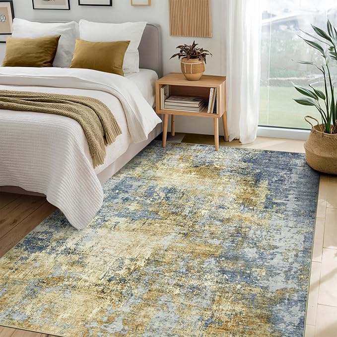 Area Rug Living Room Rugs - 5x7 Modern Abstract Soft Indoor Neutral Washable Rug Stain Resistant Non-Slip Low Pile Carpet for Bedroom Dining Room Home Office - Blue/Grey/Yellow