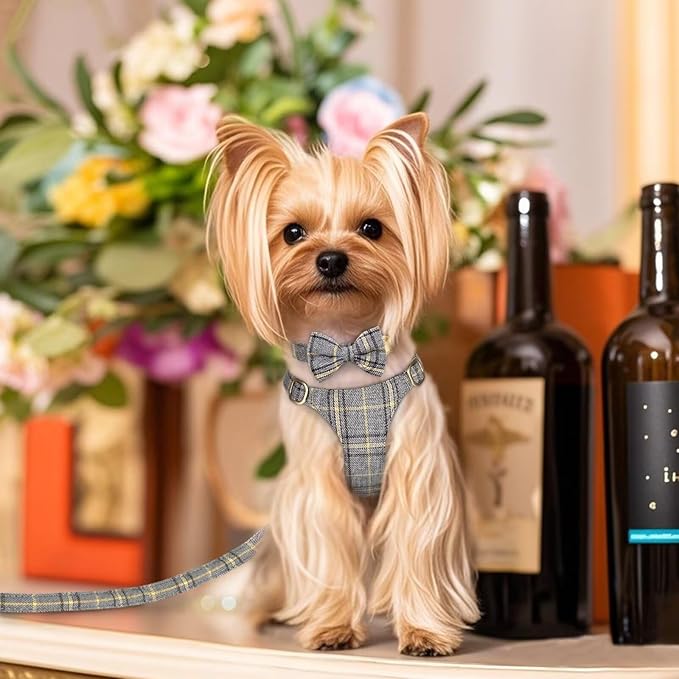 - Dog Harness Collar & Leash : One set include all will meet all your needs! Cute classic plaid dog harness come with a pet leash and a pet collar. Wearing chic set for both male and female dogs on a Wedding,New Year,Birthday & Holiday Gifts,Party Costume,Christmas,Photo Shot and Family Picnic will make your dog looks very charming and fashionable