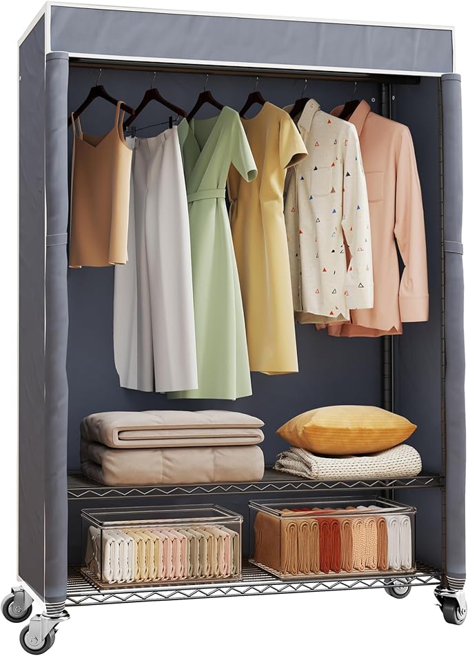 - Adjustable Shelves & Dustproof Cover: Features 3 hight adjustable wire shelves, detachable hanging rods and zippered oxford fabric dustproof cover, this wardrobe closet providing versatile storage organizer. The clothing rack can be DIY, maximizing your storage space for shoes, bedding, hanging clothing, and folded clothes as a coat rack.