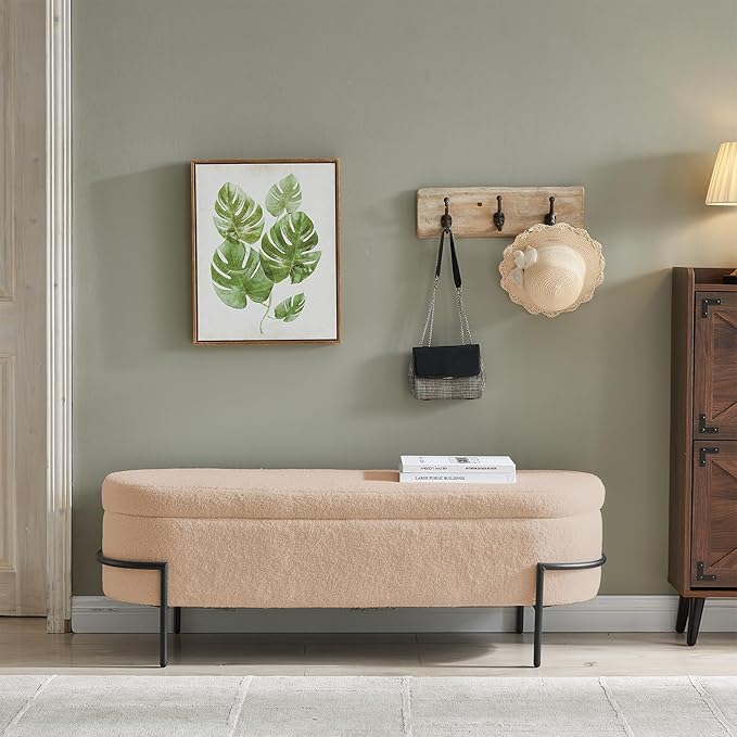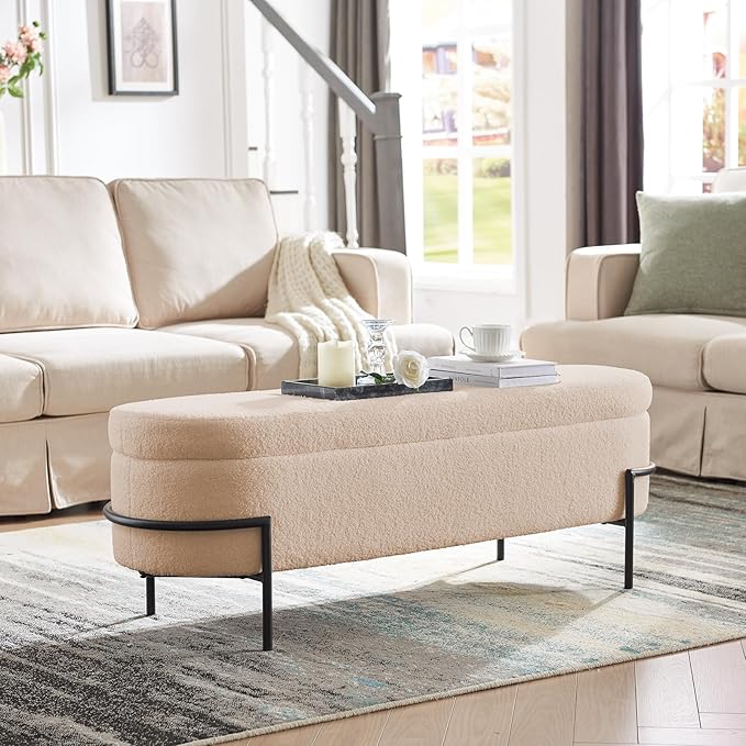 Sherpa Storage Ottoman Bench for Bedroom, Beige End of Bed Bench with Storage, Upholstered Boucle Storage Bench with Metal Stand and Hinges, Oval Ottoman for Living Room, 52 Inch