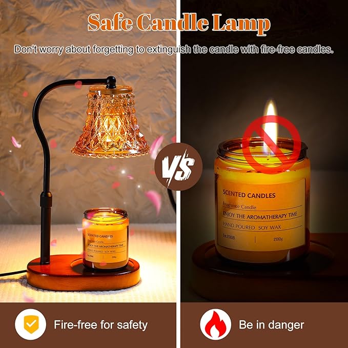 - Elegant & Versatile Design : Our candle warmer lamp, crafted with a glass candle lampshade, radiates light through translucent crystal glass, setting a romantic ambiance. The lamp's premium wooden base, paired with anti-slip pads, guarantees stability. This lamp candle warmer's adjustable height and angle make it adaptable to various candle sizes, doubling as a night light for bedrooms