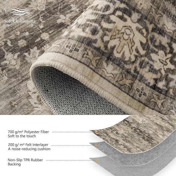 6x9 Living Room Rug Non Slip with Rubber Backing Machine Washable Soft Faux Fur Low Pile Stain Resistant Boho Vintage Euro Floral Carpet Rug for Bedroom Dining Room Kid's Room Home Office,Hazel Brown