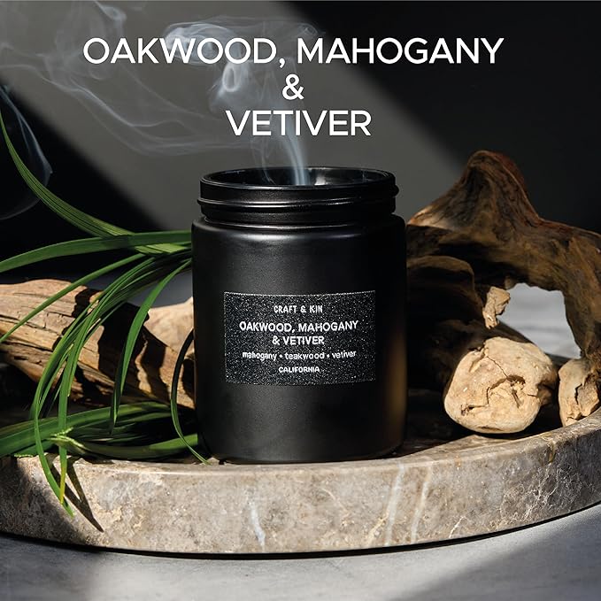 Craft & Kin Premium Oakwood, Mahogany & Vetiver Candle | Black Christmas Scented Candles for Men | Long Lasting with 45 Hour Burn Time, 7.6oz | Soy Holiday Candles | Aromatherapy at Home