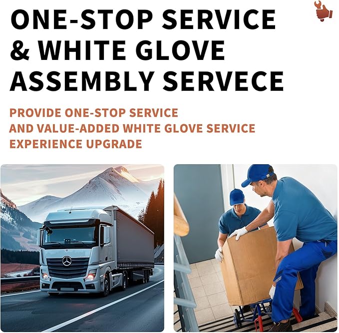 - White Glove Assembly Service (applicable only to eligible main products; single chair orders excluded) includes delivery to the designated room, unpacking, assembly per manufacturer guidelines, stability testing, and packaging cleanup.