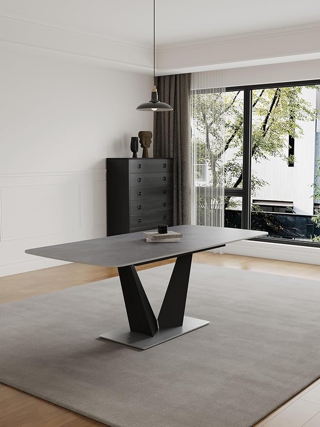 79 ”Modern Dining Table, Seats 6-8, Gray Rectangular Expandable Sintered Stone Dining Table with V-Shaped Carbon Steel Base,for Dining Room (Table)