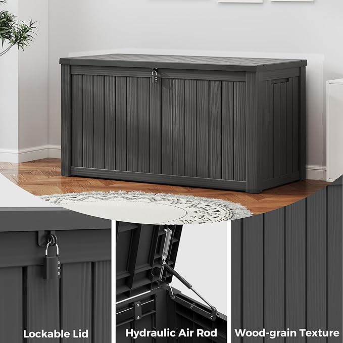 - ALL WEATHER RESISTANT - Weatherproof resin makes this outdoor storage box waterproof, rustproof, corrosion resistant and extremely low maintenance; its wood grain complements any dรฉcor; NOTE: The colour of the storage box may vary in different scenarios, with darker colours indoors and lighter colours outdoors; to avoid accidents, please remember to remove all stored items before moving the storage box!