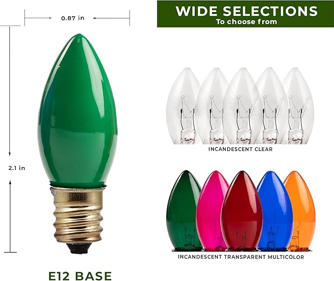 - Durable Bulbs With Ideal Spacing: Includes 25 ceramic multicolor 5W C7 bulbs on a 26 ft green wire; 12 in spacing between bulbs with 12 in lead wire and 12 in end connector for easy setup.