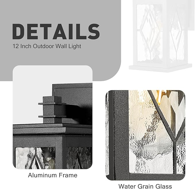 - Weather-resistant and suitable for wet locations, this exterior front porch light features sturdy aluminum construction and water grain glass shade in a black finish