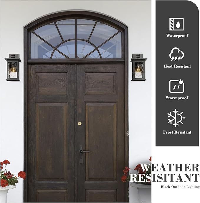 Emliviar 2-Pack Farmhouse Outdoor Wall Lights, 12 Inch Exterior Lights Fixture for House, Black Finish with Water Ripple Glass, 1803EW1-2PK-WP BK
