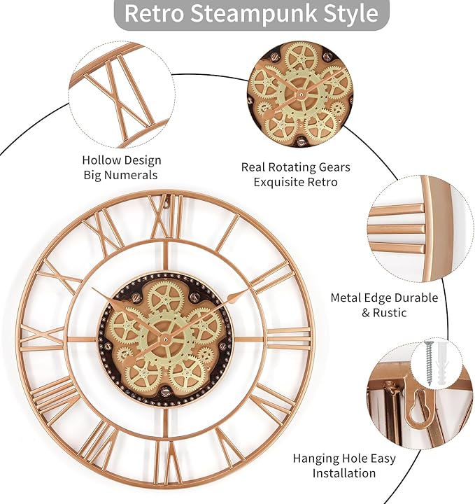 - Real Moving Gears: After the battery is powered, the gears rotate at the same time, emitting a soft tone that will not make people feel irritated. The gears are very sturdy and have a long service life. Inspired by the industrial steampunk movement, it is an eye-catching and unique antique large wall clock that will make visitors praise!
