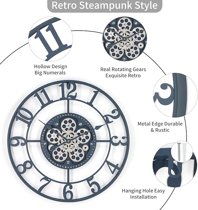 - Real Moving Gears: After the battery is powered, the gears rotate at the same time, emitting a soft tone that will not make people feel irritated. The gears are very sturdy and have a long service life. Inspired by the industrial steampunk movement, it is an eye-catching and unique antique large wall clock that will make visitors praise!