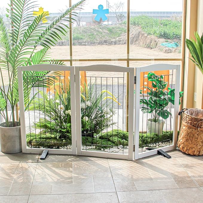 - 【Simple and Firm】This convertible wooden dog gate is a pet fence, room divider, and pet pen all in one. It combines wood and electroplated steel bars. Equipped with non - slip rubber feet, it protects your floor.