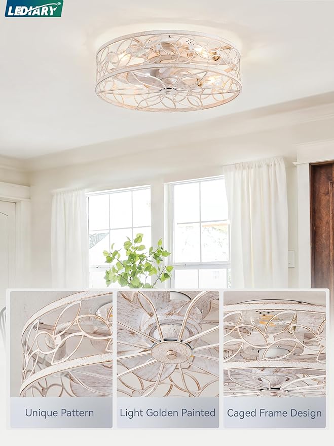 LEDIARY 20 Inch Caged Ceiling Fans with Lights, White Flush Mount Ceiling Fan with Remote, Low Profile Bladeless Ceiling Fan Light Fixture for Bedroom, Kitchen, Dining Room-White Gold Color