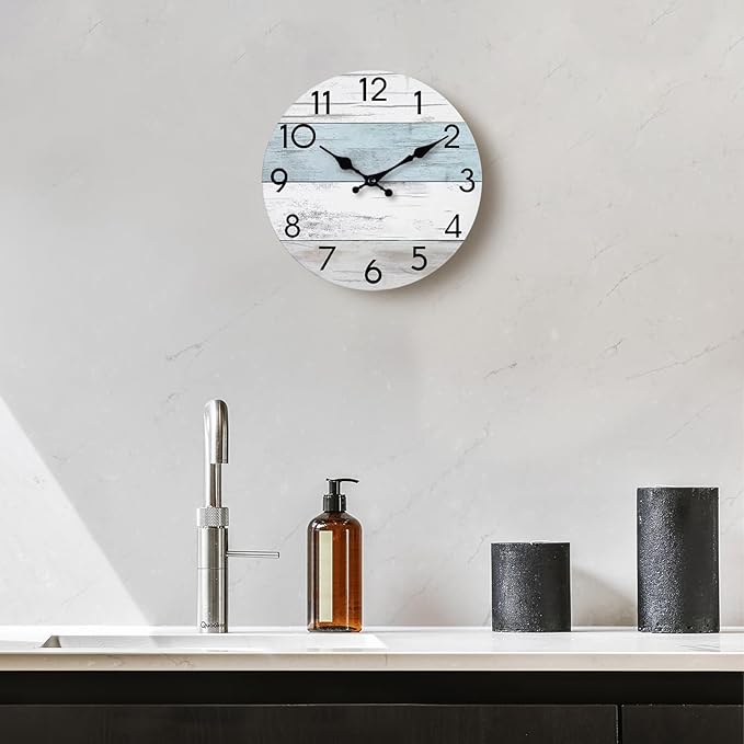 Wall Clock Silent Non-Ticking Wooden Clocks Battery Operated 10 Inch Small Country Retro Rustic and Beach Style Decorative for Living Room, Kitchen, Home,Bathroom, Bedroom (Blue)