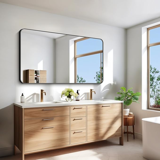- HIGH DEFINITION : This black bathroom mirrors utilizes a four-layer floating technology to provide a high-definition reflection, presenting a clear visual effect without any distortion or bloating.