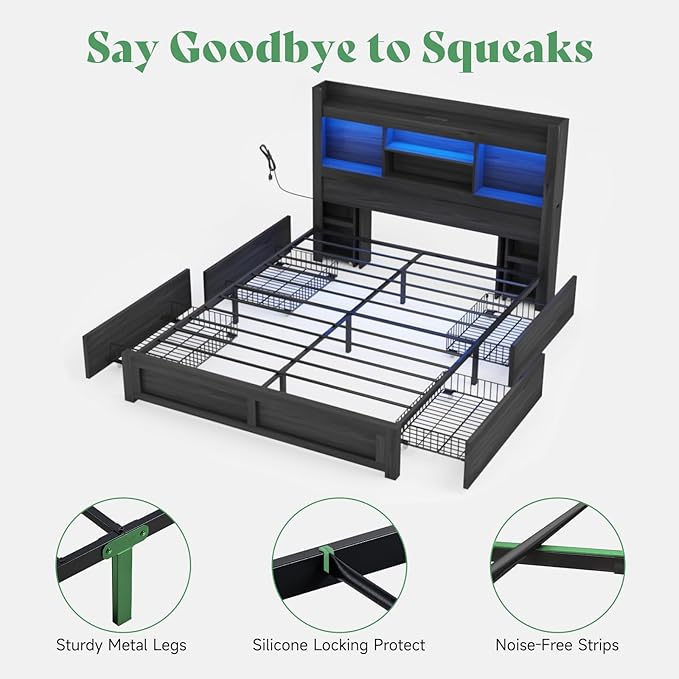 - Unique headboard side drawer: Bedframe features 4 under-bed drawers, bookcase headboard with 4 open storage spaces & 2 slide 3-tier side shelves that can be used as nightstands. This bed with storage can meet your different storage needs.