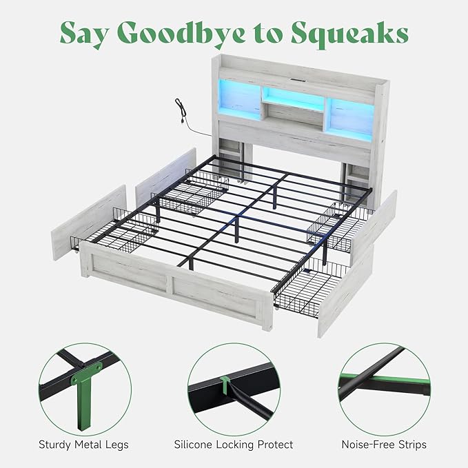 - Unique headboard side drawer: Bedframe features 4 under-bed drawers, bookcase headboard with 4 open storage spaces & 2 slide 3-tier side shelves that can be used as nightstands. This bed with storage can meet your different storage needs.