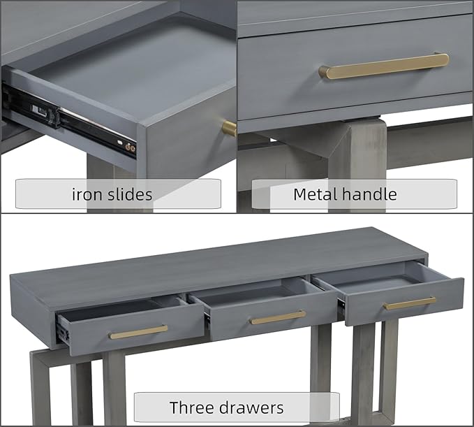 - [Functional and Versatile]The console tables for entryway is equipped with three drawers, each with a handle on top for easy opening and closing. These drawers are designed with storage needs in mind, allowing you to organize office supplies, documents, or other personal items, keeping the tabletop neat and tidy.