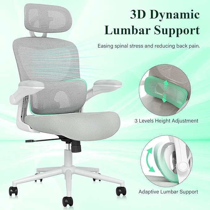 SUNNOW Ergonomic Office Chair, Comfy Mesh Desk Chair, High Back Computer Gaming Chairs with Adjustable Lumbar Support, Flip-Up Arms, Headrest, Tilt Function, Wide Cushion, Swivel Wheel, BIFMA Quality