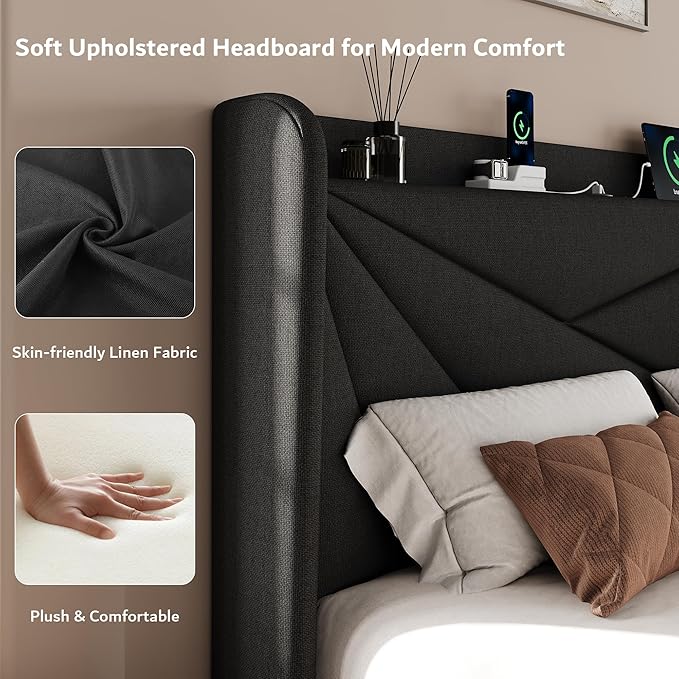 iPormis Queen Size Bed Frame with Charging Station, Linen Platform Bed Frame with Wingback Headboard Upholstered Bedframe, Solid Wood Slats Support, No Box Spring Needed, Easy Assembly, Black