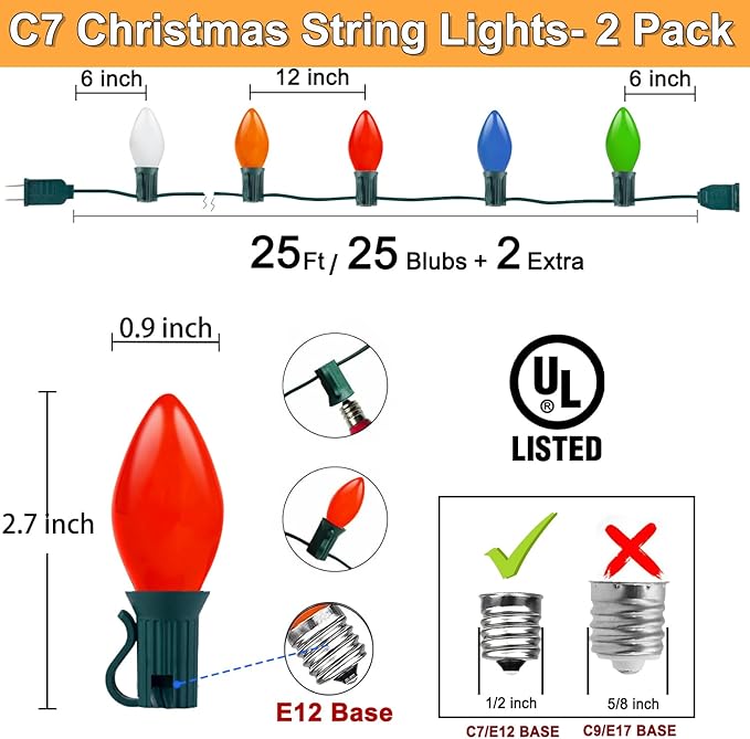 - đ ă50 Ft C7 Multicolor Christmas LightsăThis package includes 2 sets of 25 ft C7 Christmas string lights, each featuring 25 multicolor C7 bulbs in red, blue, green, orange, and white, plus 2 spare bulbs per set for a total of 50 + 4 bulbs. C7 Christmas lights are designed to keep glowing even if one bulb goes out, making it easy to create a vibrant and festive atmosphere for your Christmas!