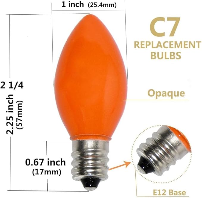 - 💖【Romantic C7 Christmas Lights】These classic C7 bulbs, set in a candelabra (E12) socket base, exude a warm, vintage glow. Each 5-watt incandescent bulb casts a soft, nostalgic light that enhances any space with a romantic and cozy Christmas atmosphere.