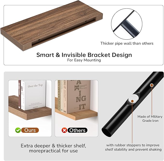 - Extra Deeper & Thicker - Each board measures 24"W x 9"D x 1.6"H. Extra deeper and thicker design in order to bring maximizes storage space and weight capacity, even hold up to 50 lb each. This floating shelf taking up zero square feet, reduces clutter and highlights dรฉcor in compact spaces.