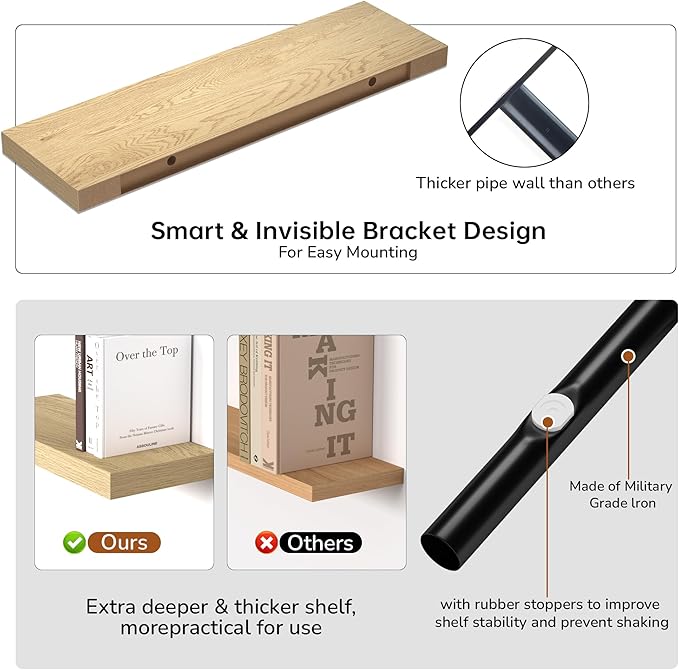 - Easy To Assemble - This floating shelves come with stainless-steel galvanized invisible brackets, toggle bolts for drywall & a simple instruction manual to help you install. The assembly of this wall shelf is very simple, only two boards and some necessary screws and other hardware, and we also have detailed instructions for you to view, you can assemble quickly. Please contact our product support team when you have any questions.