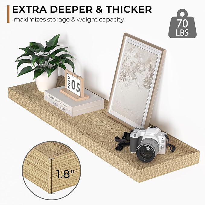 - Extra Deeper & Thicker - This wall shelf measures 36"W x 10.23"D x 1.8"H. Extra deeper and thicker design in order to bring maximizes storage space and weight capacity, even hold up to 70 lb. This floating shelf taking up zero square feet, reduces clutter and highlights dรฉcor in compact spaces.