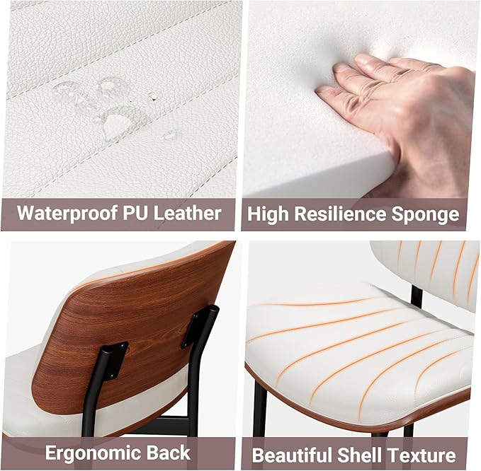 Dining Chairs Set of 4, Mid-Century Modern Upholstered PU Leather Chairs with Walnut Bentwood Back and Metal Legs Adjustable Feet for Kitchen Dining Room, Off-White Shell Strips