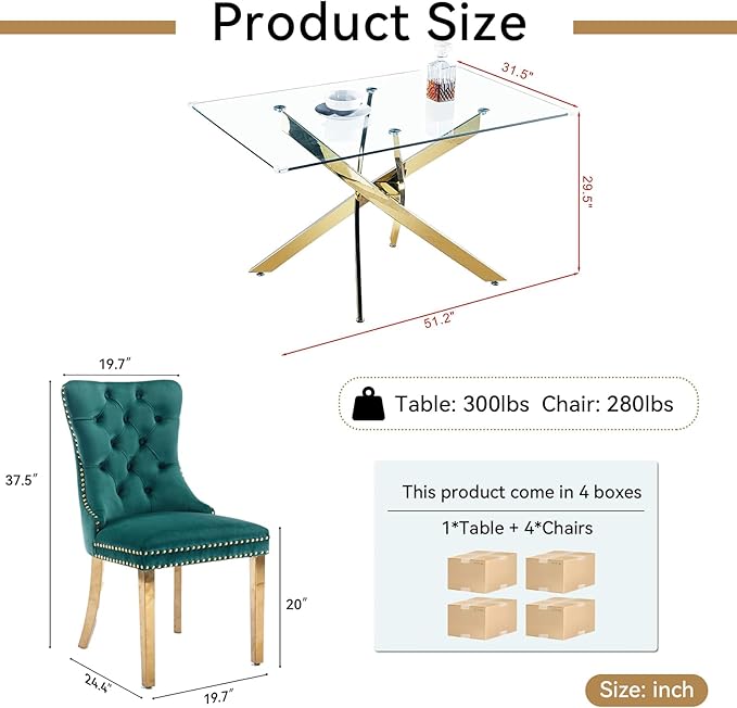 • ➤【Modern 5 Piece Dining Table Set】- Complete 3 pieces dining set consisting of 1 rectangular glass dining table and 4 velvet dining chairs which makes it perfectly sized for a dinette, kitchen, or dining area. This tempered glass top dining table with cross shaped chromed stainless steel legs and velvet upholstered dining chairs add elegance to your dining room while its ultra-modern design can easily blend in with any home kitchen dining room decors.