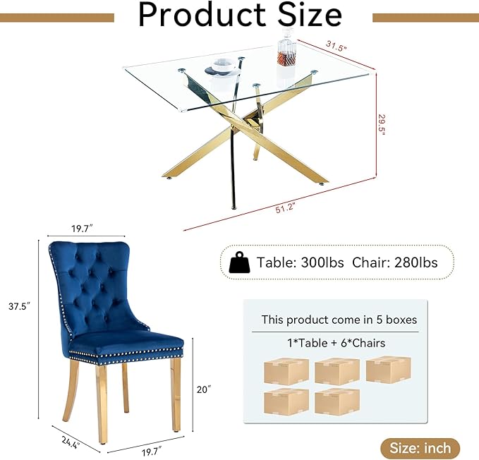 Goujxcy 51" Glass Dining Table Set for 6, Modern Kitchen Table and Chairs Set w/Steel Legs, 7-Piece Dining Table Set w/Glass Gold Dining Table and 6 Blue Velvet Chairs for Kitchen Dining Room