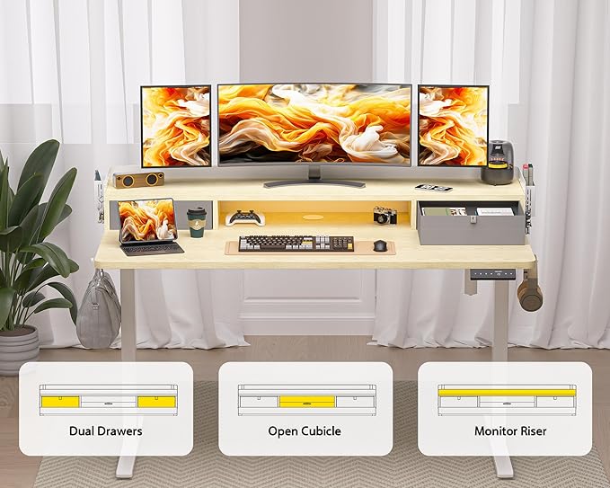 55x24 Inches Electric Standing Desk with 2 Drawers, Height Adjustable Stand up Desk for Home Office, Ergonomic Sit to Stand Table with Storage Shelf, DIY Board, Hooks, Oak