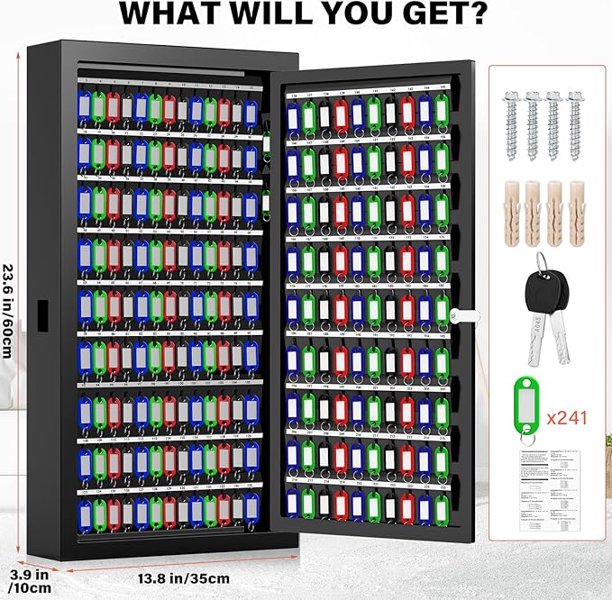 - Key Safe With Additional 16 Side Hooks And Key Tags: The key organizer that holds 225 keys also has 16 hooks on the side. The key lockbox is suitable for storing various car keys, door keys and some small valuables. The key safe has numbered key hooks and 241 colored key tags, and you can mark the key tags separately according to the purpose of the keys. After classifying and managing the keys, you can easily find the key you are looking for and save your time