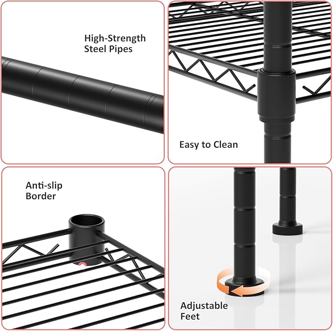 - 【Adjustable and Detachable】 The height of the rack shelf can be adjusted arbitrarily to achieve flexible storage. wire shelf can be assembled or disassembled into two or three layers. You can split it according to your actual needs, or you can put several shelves together to create more storage space, it is the perfect shelf for the kitchen, warehouse, living room, pantry, office, and more.