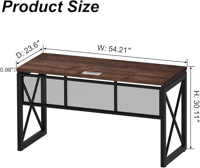 - Dimension and Long Lasting Material: 54.21"W x 23.62"D x 30.11"H. Desk top thickness: 0.98". Craft from metal and high grade MDF with vintage wood grain. This wood metal desk can be used as work desk for home office, writing table for study, modern gaming desk etc.