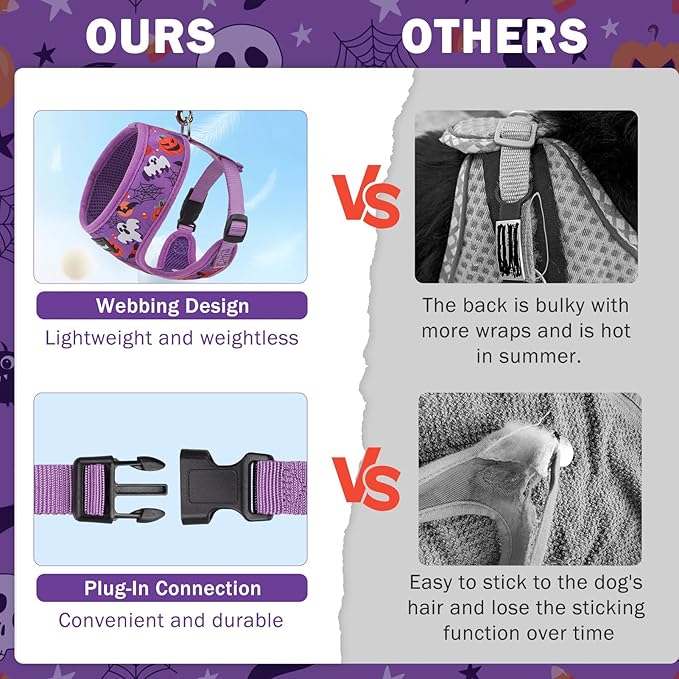 - DOG HALLOWEEN VEST HARNESS SET: The purple puppy harness is printed with a pattern of pumpkin ghosts bats spider webs and other Halloween elements. The festive elements are strong and the combination of harness, leash and collar can be used together. Show off different fashion and cuteness during walks.
