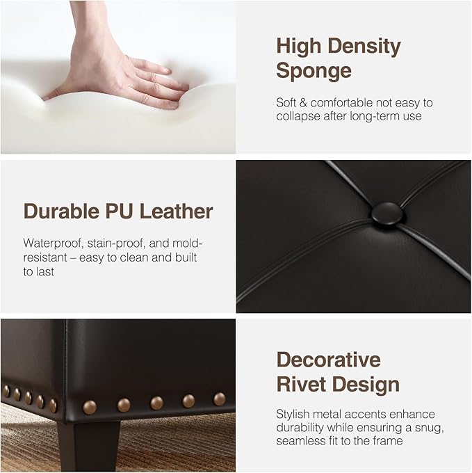 - Aesthetic and stylish Decor: The square leather ottoman is made of high-density foam and faux leather fabric material, the top tufted button decoration, and the bottom metal rivets locking edge craftsmanship, showing the elegant mid-century style