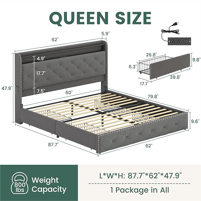 - [Plenty of storage]: With four spacious drawers, headboard storage and additional storage pockets, you can keep your belongings organized and easily accessible