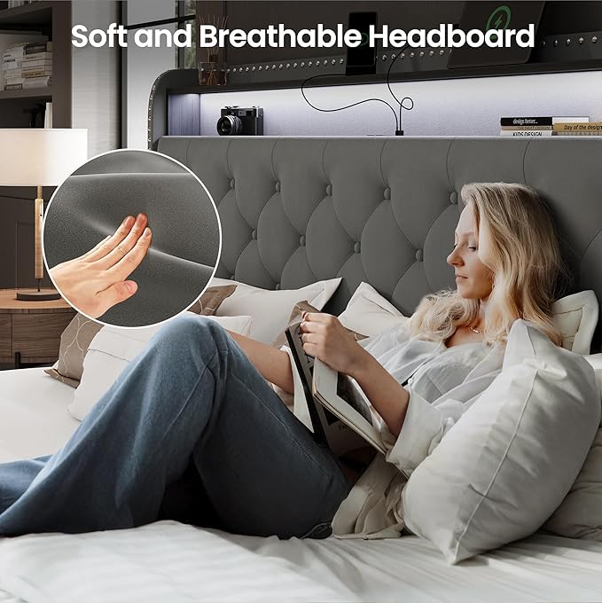 - [Sleek Led lighting]: The tufted bed frame builds LED lights in the headboard. Then it could creat a relaxing and ambient atmosphere in your bedroom
