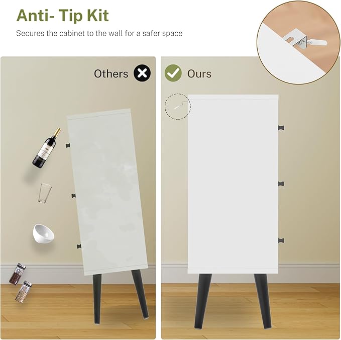 - ⭐【More Stable Than It Look】Don't need worry wobbling or collapsing. Our storage cabinet is made of premium MDF (P2 grade) and solid wood leg which promises a long service life and boasts great stability(Can support weight 150lbs). Environmentally friendly surface ensures no harm and odorless.We attach anti-toppling fittings helps secure it to the wall for a safer living space.