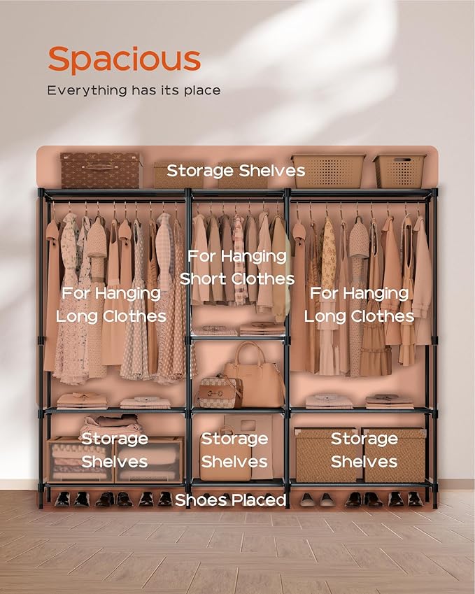 - [Versatile Storage Areas] This closet has 1 area for hanging short clothes and 2 areas for hanging long clothes, as well as multiple shelves for folded clothes. The top area of the wardrobe can holds storage boxes, bags and other items, and the space under the bottom shelf for shoes; maximize your storage needs.