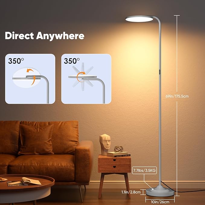 - 36W Super Bright & Lighting without Limits: We are proud to introduce this 2024 innovative led floor lamp with 36W super brightness, enough to illuminate the whole room through precise high power and optimized optical design. Now featuring a versatile omnidirectional head with a 350° rotation capability, and its 69-inch height offers limitless lighting angles for any setting. Flip it upward to turn it into a stunning torchiere floor lamp, or angle it for the perfect reading light — the choice is yours with this flexible, all-encompassing lighting solution